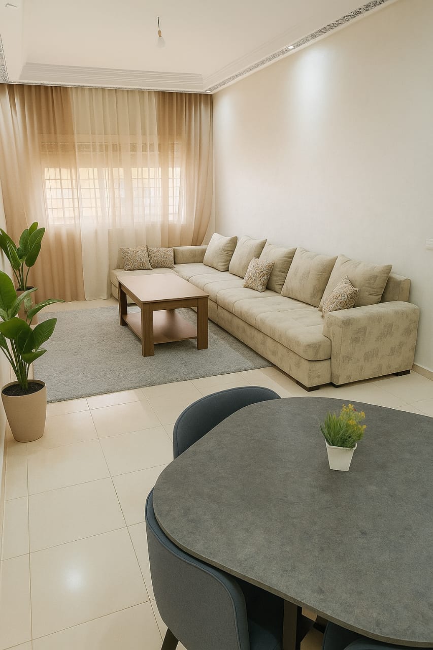 Experience luxury in this prestigious apartment situated within a newly constructed building. Nestled in the tranquil upper area of the lively Agdal neighborhood, this spacious apartment is perfect for your capital city stay. It comprises a generous bedroom with an ensuite bathroom, a welcoming living area with an additional guest bathroom, outdoor space, and a highly functional kitchen. Furthermore, you'll find all the essential amenities for a nice stay, wifi, dishwasher, washing machine etc