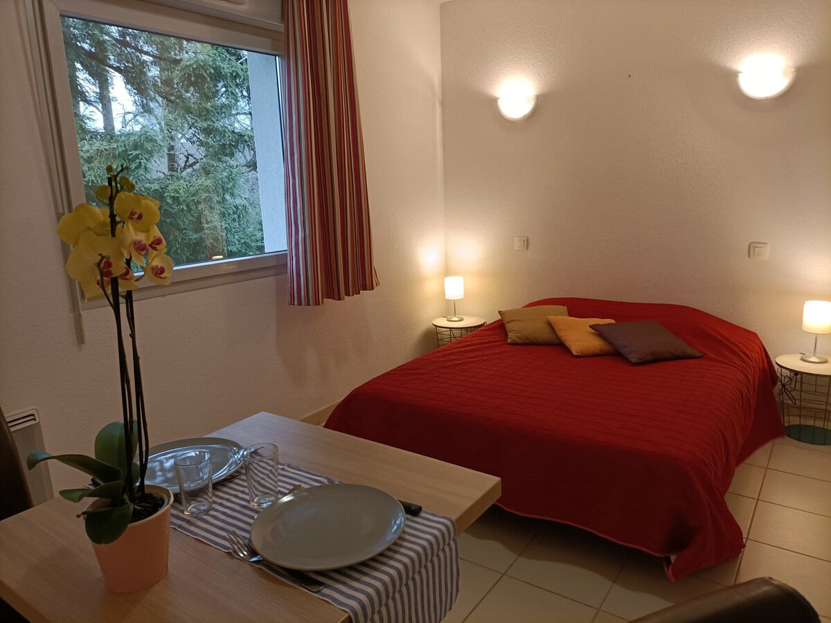 Sous les Pins, lieu paisible, avec piscine extérieure chauffée de mi-Mai à fin Septembre, table de ping-pong et boulodrome, jeux pour enfants, laverie. Proche du lac(1km) et de la plage(2km), la forêt est accessible en sortant de la résidence. Les pistes cyclables vous entourent ce qui fait de cet endroit un lieu de vacance familial idéal, alors poser la voiture! Appartement (32m2) parfait pour 4 pers, une grande terrasse plein sud, offrant une vue sur la piscine et la forêt du golf de Pinsolle.