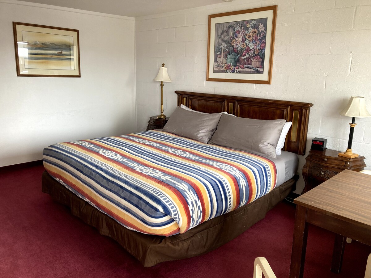 Situé au cœur de l'Idaho central, le Red Rock Lodge propose une variété d'options de chambres, notamment des chambres King, Queen et Double Queen. Les options de chambre supplémentaires comprennent des kitchenettes et un canapé-lit. Une aile du lodge comprend des salles de bains entièrement rénovées. Vous adorerez l'atmosphère charmante qui met en valeur les aspects merveilleux et magnifiques du centre de l'Idaho. La chambre S4 dispose d'un lit Queen simple. Elle est dans notre aile rénovée et dispose d'une douche récemment carrelée, pas de baignoire.