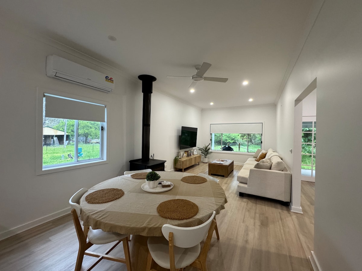Un chalet calme et spacieux dans une ferme en activité dans le nord-est de Victoria, niché près d'un ruisseau saisonnier et de beaux gommiers. Situé à 15 minutes de Benalla (et de l'autoroute Hume), à 2,5 heures de Melbourne et à moins d'une heure de vignobles renommés, d'excellents restaurants et des attractions telles que le Silo Art Trail.