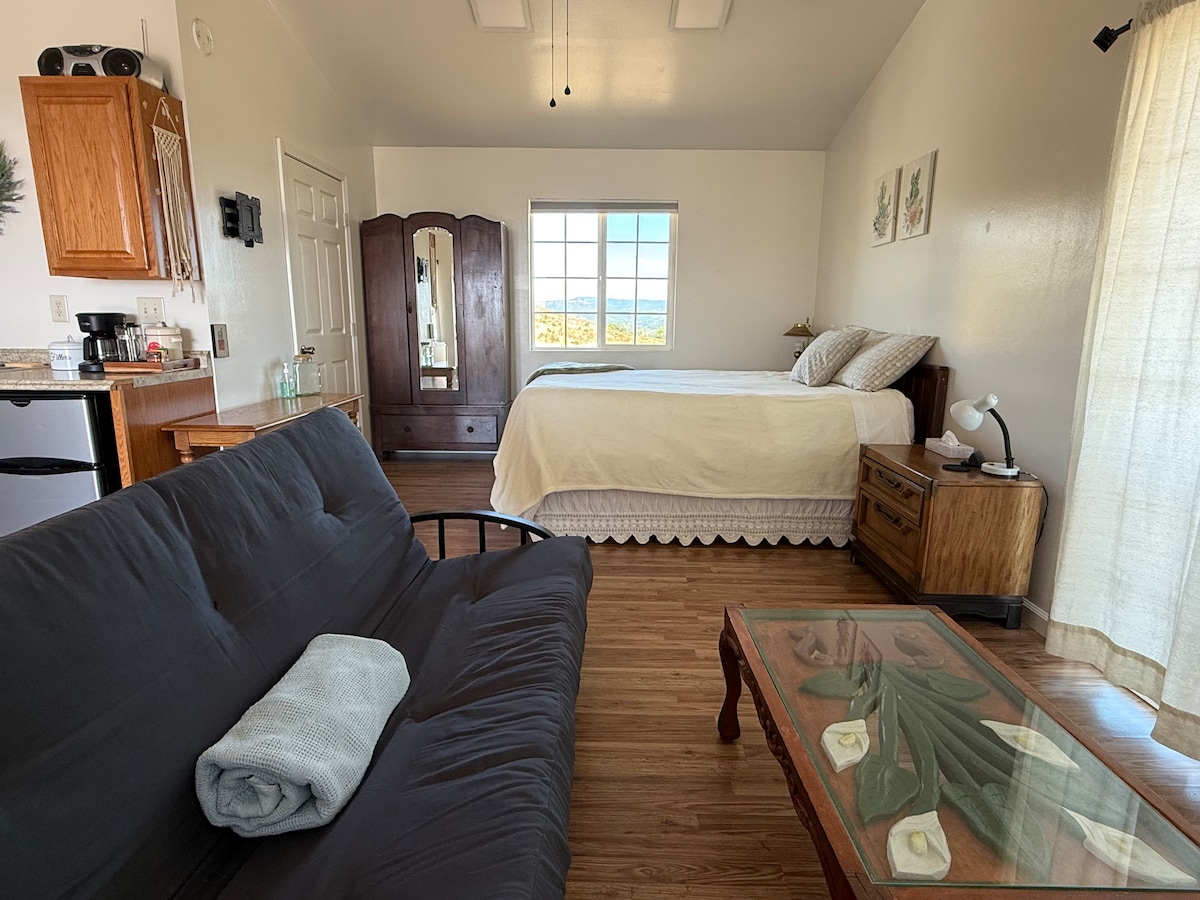 Le Hideaway est une casita d'une pièce enchanteresse située sur la crête extérieure de la propriété, The Confluence. Réveillez-vous au lever du soleil avec une *vue* luxuriante sur la campagne naturelle depuis votre terrasse privée. Le refuge est accessible par un sentier pédestre (200 pi) depuis la maison principale. La salle de bain privée est à côté de la maison principale (à 200 pieds de la chambre). Du parking à la chambre, il y a environ 400 pieds. Il n'y a pas de cuisine ni d'appareils de cuisson autres qu'une bouilloire et un mini-réfrigérateur.
