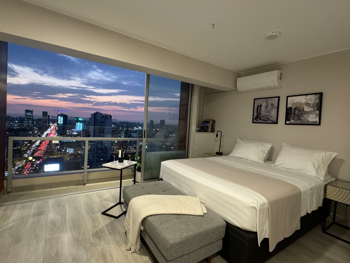 Bienvenue à Sky Lima 28, où une expérience unique vous attend au 28e étage. Profitez d'une vue panoramique imprenable sur la ville de Lima et l'océan Pacifique tout en vous imprégnant du style inégalé du coucher de soleil de Lima dans le confort de votre hébergement. Rassurez-vous, votre vie privée et votre sécurité sont garanties. Au plaisir de vous accueillir bientôt !