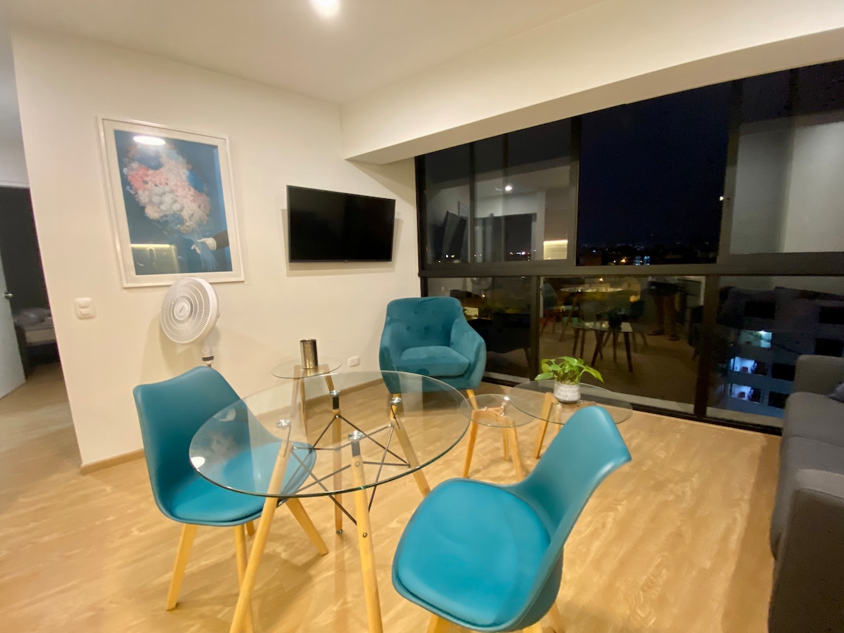 Loft moderne de première classe, très bien situé et avec une vue panoramique incroyable depuis le 35e étage. Accès facile aux avenues principales, centres commerciaux, musée, train, centre financier, cliniques, gymnases, parcs. Il dispose d'une buanderie, d'une salle de bain principale, d'une kitchenette, d'une cuisine équipée, d'un dressing, d'eau chaude, d'une télévision et du WIFI. Espaces communs : point de vue sur la ville, Rooftop, Co-working. Proche des quartiers touristiques tels que Miraflores, Barranco et le centre historique de Lima.