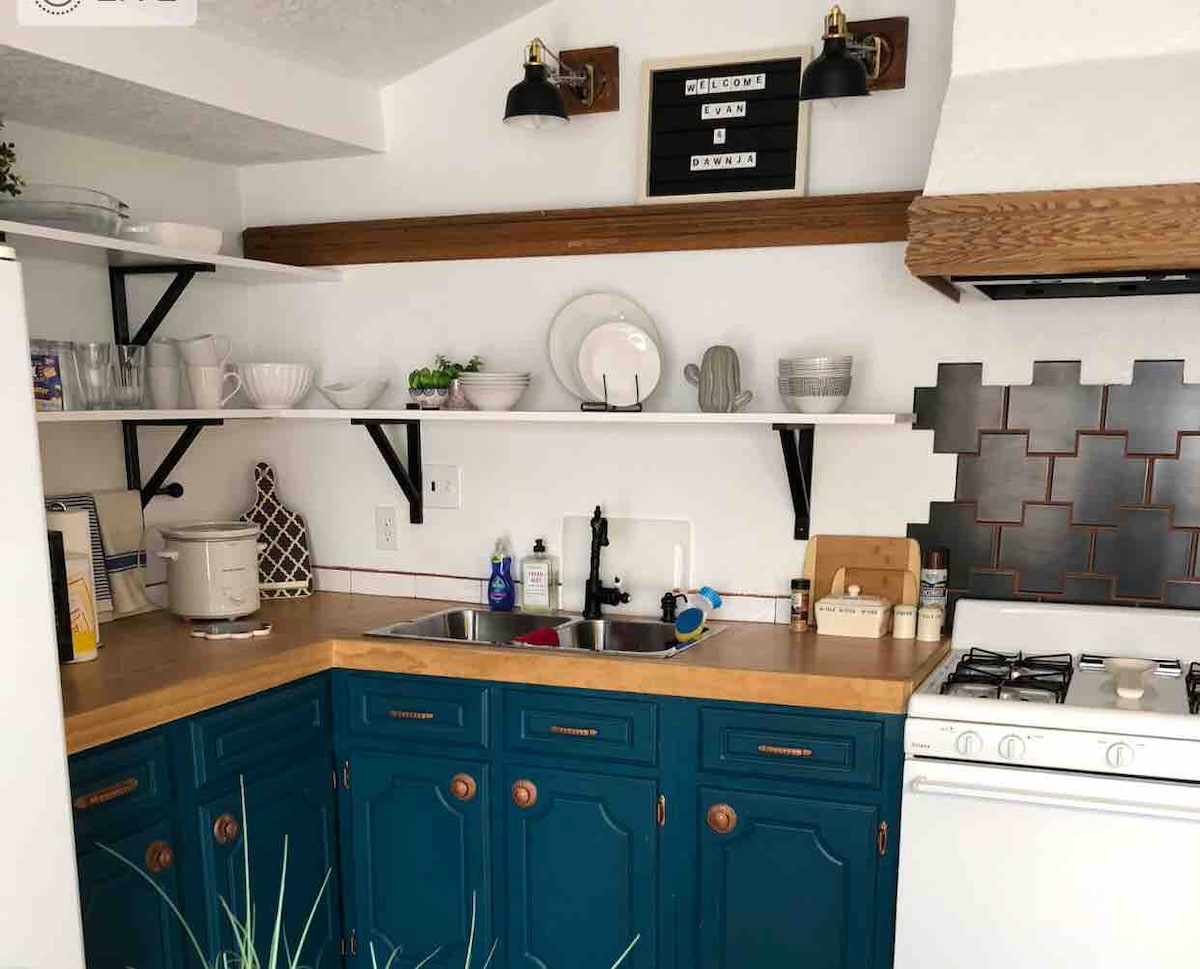 Cette petite maison d'hôtes cachée derrière notre maison de campagne SW. C'est le petit endroit parfait pour s'arrêter à la fin de votre journée et se détendre. Si vous êtes en voyage d'affaires prolongé ou en aventure dans le sud-ouest, cet endroit sera un endroit confortable pour vous reposer les pieds et la tête dans les quatre coins. Nous avons des réductions hebdomadaires et mensuelles et des frais de ménage fixes de 50 $. Tout ce que nous demandons, c'est que vous le traitiez comme votre propre maison et que vous vérifiiez vos effets personnels lors de votre départ.