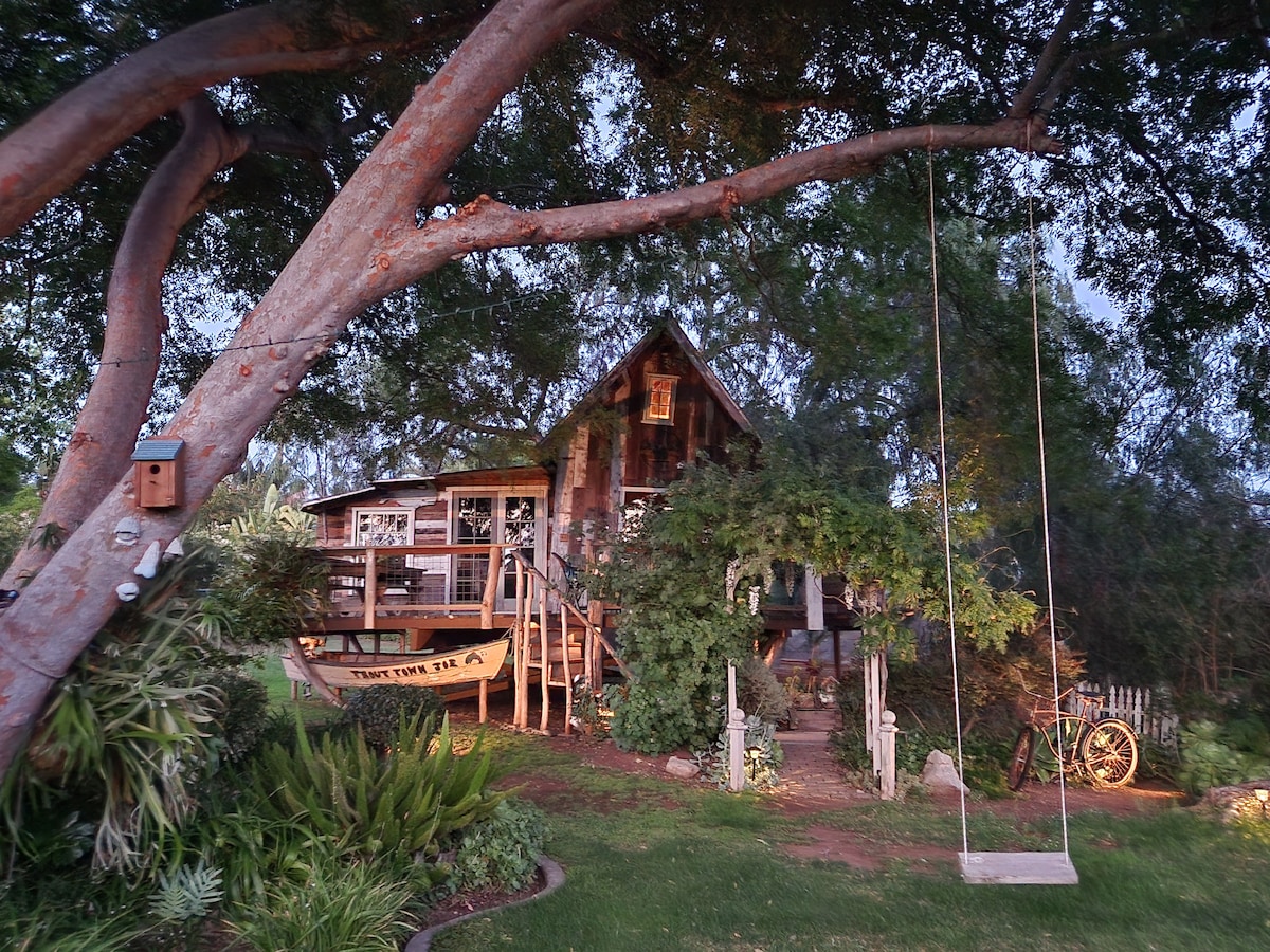 La cabane dans les arbres Whimsical Treehouse est pleine de charme rustique. Construit sur une période de 2 ans et construit de manière imaginative en utilisant une variété de bois, combinant texture et créativité visuellement agréable Salon confortable avec un canapé-lit queen et des sièges pour 4 à 6 personnes. La chambre est un loft à l'étage avec un lit complet. Coin repas 4 places Grande table de pique-nique sur la terrasse et foyer Profitez de l'orme qui protège de la cabane dans les arbres et de la belle cour arrière Savourez la cour herbeuse, les plantes grasses et la balançoire Interdit de fumer et pas d'animaux Wifi, chauffage, climatisation