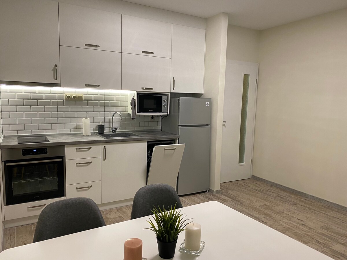 Appartement neuf, lumineux et élégamment meublé dans un immeuble récemment construit. L'appartement se situe à 20m de la rue centrale de la ville. L'appartement dispose d'une cuisine, d'une chambre, d'une salle de bain avec toilettes et d'une terrasse. Le canapé du salon est étiré et convient aux enfants jusqu'à 8 ans. Un lit pour bébé est disponible sur demande. Internet gratuit et rapide et télévision par câble. Place de parking sécurisée. Le bâtiment dispose d'un ascenseur.