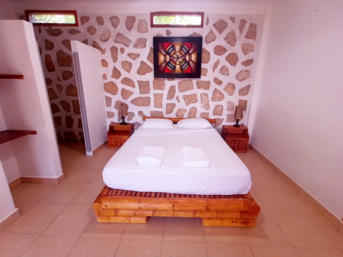 Chambre climatisée avec salle de bain privée en suite, avec utilisation d'un salon et d'une cuisine partagés avec deux autres chambres. Situé dans un chalet indépendant à l'intérieur de la copropriété La Otra Ola, directement sur la plage dans la ville d'artistes et de surfeurs de Ayampe. CONSULTEZ LES RÉDUCTIONS POUR LES LONGS SÉJOURS EN BASSE SAISON Il dispose d'un lit superposé (lit double /matelas à ressorts en bas et lit 1 place en haut. En outre 1 hamac pour les siestes