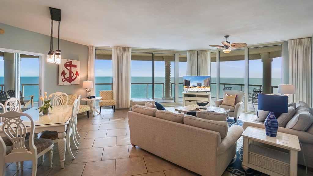 Tower 1 1403 ~Bright cheery modern decor and family friendly furnishings. Sunset views every day from your private balcony. Open floor plan from kitchen to living room allows you to see the view from anywhere in the condo. 2 master suites each with king bed, gulf views & door to balcony. Private bathrooms! Dining room seats 6 with 4 additional spots at the kitchen bar. 100 yards to the beach and right across from the spa, fitness center, restaurants, and market in the Lifestyle Center.