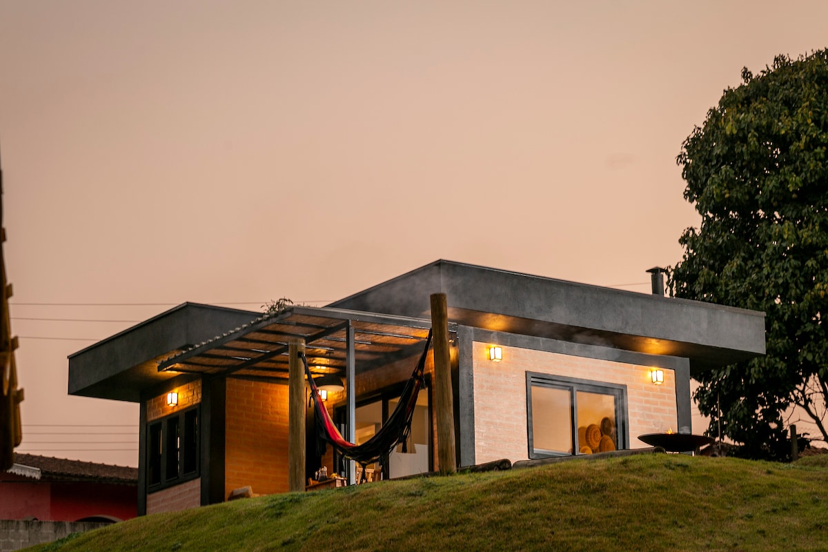 Oubliez vos soucis dans cet endroit spacieux et calme. Chalet neuf, charmant et confortable. Bien situé, à 02 km du centre, au sommet de la colline, avec une vue à 360 degrés, du Pico Agudo, de la Pedra do Baú et un beau coucher de soleil. Endroit très calme, tranquille et privé, avec beaucoup de nature autour. Grand espace autour du chalet à profiter. Idéal pour passer des moments inoubliables à deux.