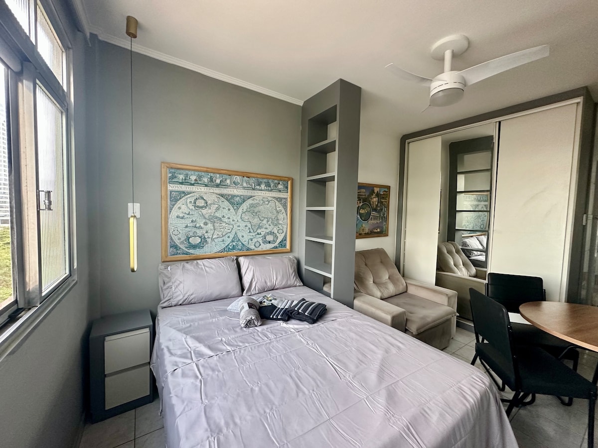Stúdio moderne haut de gamme sur la plage d'Itararé ! Emplacement confirmé. - à 5 minutes du téléphérique - Devant la piste d'atterrissage du delta d'Asa - 20 minutes de l'île de Porchat - 15 minutes de Millionaires Beach - 15 min de la plage de José Menino - 15 min de la municipalité d'Orquidário de Santos - 15 min de l'émissaire sous-marin de Santos - 5 min de Habib 's Éléments ; - Horloge numérique - Wi-Fi - Climatisation - Micro-ondas -afeteira -Secador -TV c/ Netflix - Mobilier et cuisinière à induction Linge de lit -Toalhas