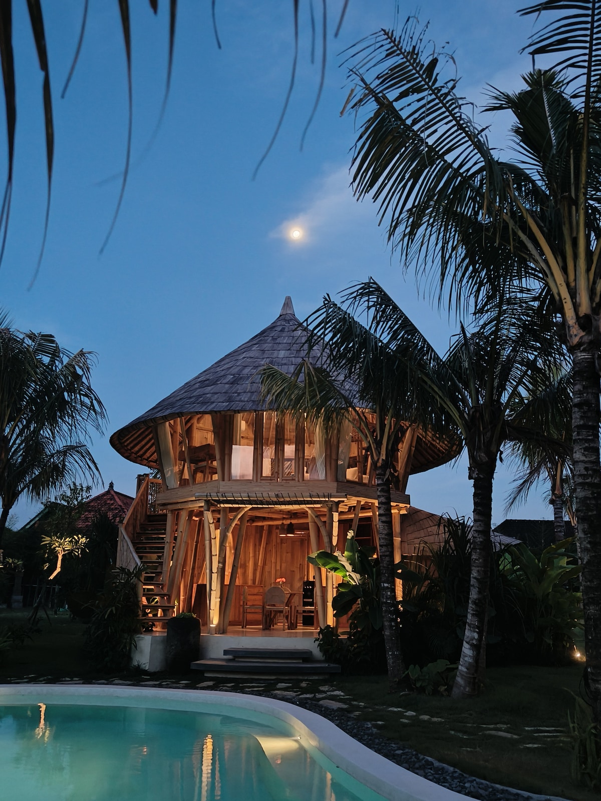 Zone sans inondation Bienvenue à la Villa Dwipa, ☀️ un endroit où vous pouvez vous adonner à la beauté et au luxe d'une villa en bambou entièrement privée et de toutes ses installations entourées d'une nature paisible. 🍃 Que vous soyez amis ou amoureux, nous vous garantissons un bon moment, que ce soit pour plonger dans la piscine privée, regarder un film sur l'écran de cinéma déroulant, faire la fête sans voisins dans le salon, passer des moments paisibles, vous détendre confortablement sur le balcon et tout le reste. 😊