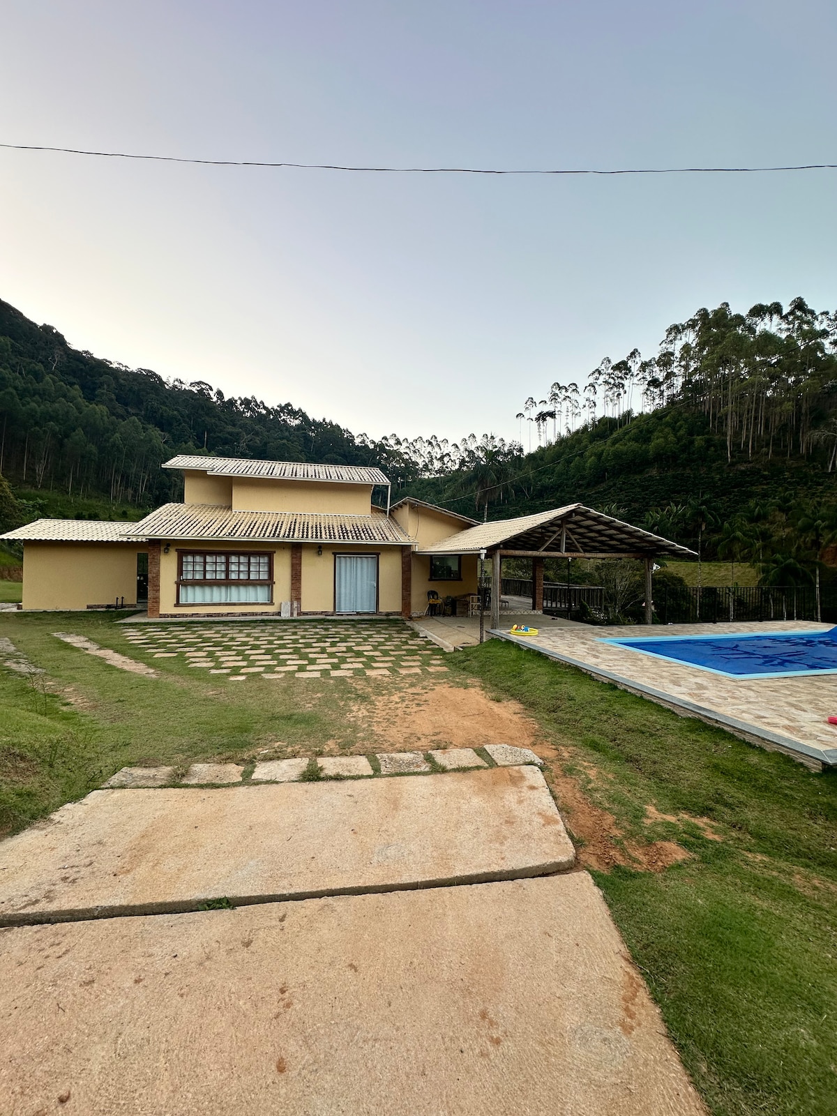 Casa de campo cercada pela natureza, a 17 km do centro de Santa Teresa, ideal para descanso em família. Possui 3 quartos: 1 suíte com cama king, 1 quarto com cama de casal e berço, e 1 com 3 camas de solteiro. Conta com banheiro social, banheiro externo, sala, cozinha equipada, churrasqueira, forno e fogão a lenha, academia completa, garagem para 2 carros, Wi-Fi e o grande destaque: piscina aquecida para aproveitar em qualquer época do ano. Não há sinal de telefone no local.