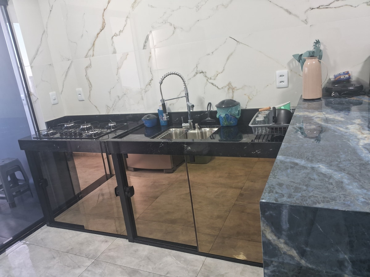 🏠Casa no andar térreo do Sobrado na Chácara Filhos da terra. A casa possui: ✅Piscina compartilhada; ✅Campo de futebol; ✅redário; ✅Cozinha completa; ✅Sala com SMART TV; ✅ Wi-Fi disponível; ✅ Armador de rede; ✅ Churrasqueira portátil; ✅ Cozinha secundária com fogão a lenha; ✅Roupa de cama, lençóis, coberta e papel higiênico; e ✅ Todos os utensílios domésticos. ✳️A casa suporta 7 pessoas 🔴 Não disponibilizamos tolhas de banho e rosto, nem sabonete e nem shampoo. * As fotos são da casa de baixo.