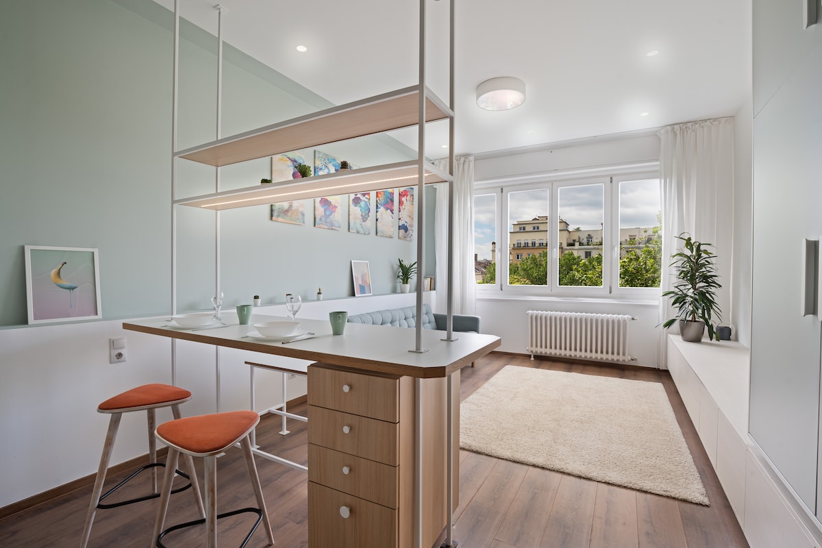 Our 40 sqm apartment is perfect for couples, good friends, or small family. The studio has a private entrance from the community corridor, a dining room, a well-equipped kitchen, a bathroom with shower, a cozy living room and a gallery room with a double bed. A soothing modernist interiors emphasizing comfort, harmonized proportions, and calming color palettes. The studio is by the Danube Riverside, steps from the Margaret Bridge, and surrounded by coffee shops, cafes, and restaurants.