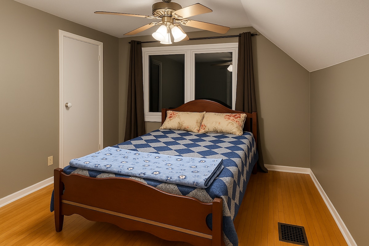 Suite au sous-sol avec sortie indépendante, chez Kevin et Wendy. Cette suite se trouve à quelques minutes du centre-ville, de l'aéroport et de 2 hôpitaux, ainsi qu'à quelques pas du magnifique sentier Meewasin et de la rivière. La suite dispose d'un lit King Size et d'une télévision dans la chambre. Il y a une petite kitchenette qui comprend un petit réfrigérateur, une plaque de cuisson à induction, une machine Nespresso et un micro-ondes. Il y a une terrasse privée très calme avec un barbecue et un foyer.