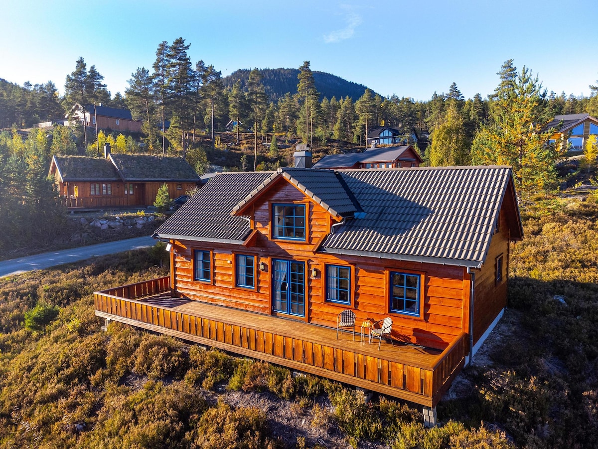 Vues Panoramiques au-dessus de Vrådal Cette maison de vacances exceptionnelle bénéficie de l’une des situations les plus spectaculaires de Vrådal, perchée en haut du champ de cabanes, avec des vues imprenables sur le lac Nisser, Bussvikfjorden, le parcours de golf, la station de ski et le village en contrebas. Entourée de nature préservée et bordant la forêt, ce refuge paisible se trouve au bout d’une impasse, garantissant intimité et tranquillité totales.