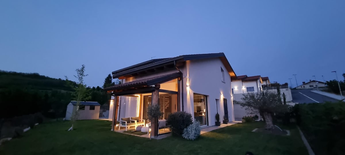 Le rez-de-chaussée de la villa, avec open space, cuisine ouverte avec îlot et coin nuit est complété par un beau jardin extérieur, et est une maison avec une atmosphère détendue et familière. Au coucher du soleil, depuis la véranda, en dégustant un verre de vin, vous pouvez voir le ciel qui s'enflamme et se peint de couleurs et de contrastes Guarene est l'un des 100 plus beaux villages d'Italie, à proximité du centre historique d'Alba, la reine des terres de Langhe et Roero reconnues au patrimoine mondial de l'UNESCO