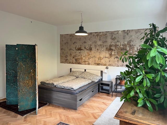 Profitez de la vie dans ce logement spacieux calme et central avec une chambre séparée, un grand salon avec possibilité de couchage, une cuisine, un parking gratuit dans la cour, l'utilisation du jardin avec un poêle à bois, un tramway et un bus dans les environs immédiats et pourtant calme et idyllique.