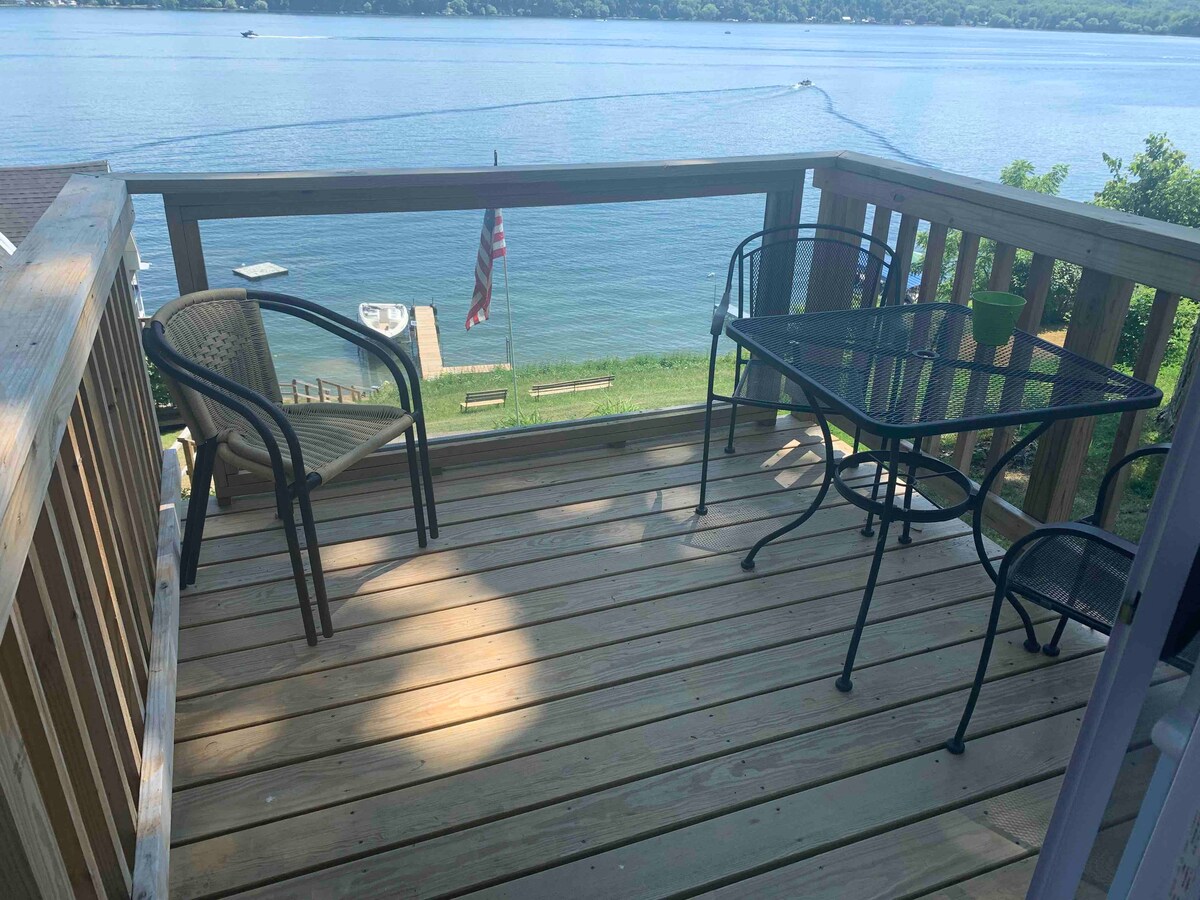 Un véritable refuge... paisible, calme et majestueux. La maison est juste sur le lac avec une vue magnifique sur le lac Seneca. De grandes fenêtres donnent sur le lac depuis le séjour et la chambre avant. Maison individuelle unifamiliale située dans une rue sans issue limitée à la circulation locale, cette maison de 2 chambres et 1 salle de bain et demie toute l'année vous fournira tout ce dont vous avez besoin pour votre prochaine escapade. La maison est parfaite pour 2 couples ou une famille de quatre personnes. Chambre supplémentaire au-dessus du hangar à bateaux avec un canapé convertible.