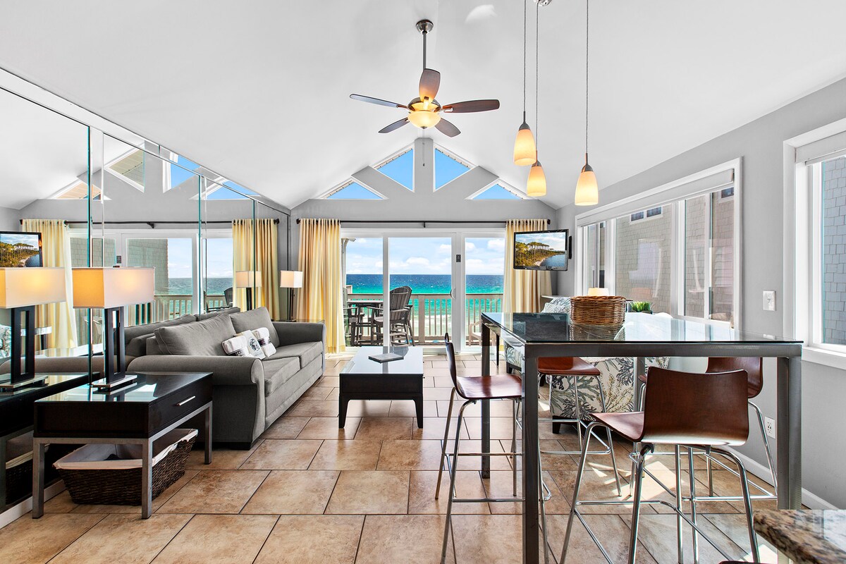 Serenity at Seamist 9 dispose d'un accès privé à la plage et est l'une des 12 unités privées dans un quartier calme du 30-A. Profitez de vacances paisibles à la plage dans cet exquis appartement en bord de mer. Vous serez accueillis par des vues à couper le souffle qui correspondent aux magnifiques accents turquoise de la maison. Rendez-vous sur votre balcon privé pour observer de plus près les eaux brillantes et bleu-vert du golfe. Prenez votre boisson préférée et asseyez-vous sur les chaises pivotantes supérieures. L'endroit idéal pour observer les dauphins