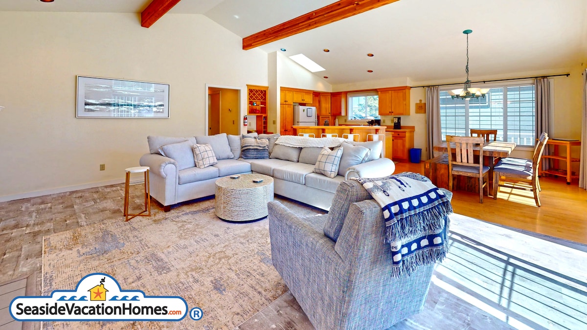 Maison familiale historique magnifiquement rénovée sur la rive de la rivière Necanicum à Seaside. À distance de marche des commerces et de la promenade en bord de mer. Chargeur universel de voiture électrique de niveau 2. La maison dispose d'une grande cuisine lumineuse entièrement équipée, d'une salle à manger, d'un grand salon, d'une bibliothèque, d'un porche avant fermé enveloppant. Faites griller des S'mores autour du foyer. Barbecue dans la cuisine extérieure couverte. Profitez d'un livre dans la bibliothèque, jouez à des jeux de société ou détendez-vous dans l'une des 4 chambres pouvant accueillir 12 personnes et 3 petits enfants, 9 lits au total.