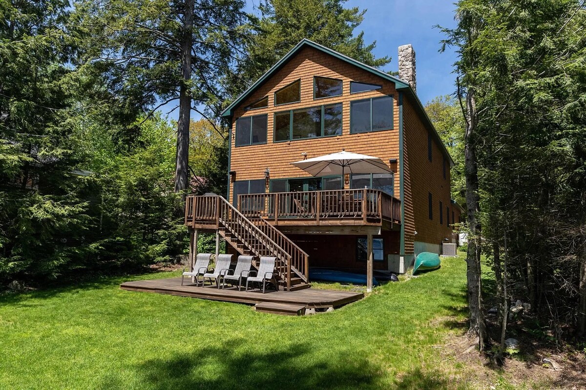 Charmant chalet au bord du lac à seulement 29' de la ligne de flottaison, avec 65' de front de mer privé. Le chalet est une maison classique 3 saisons, L.C. Andrews, bordée de bois du Maine, au bord d'un lac d'été. Ambiance confortable et un merveilleux porche fermé avec une vue imprenable sur le front de mer. Profitez de la pêche au large du quai, de la randonnée, du canoë-kayak, du feu de camp et de l'exploration des environs. Les climatiseurs assureront votre confort pendant les chaudes nuits d'été et l'Internet haut débit maintiendra vos appareils connectés. L'ameublement est un mélange familial.