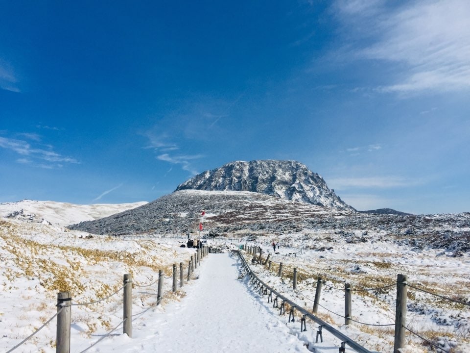 Un bel hébergement avec la mer bleue dans la cour avant et le mont Halla dans la cour arrière
