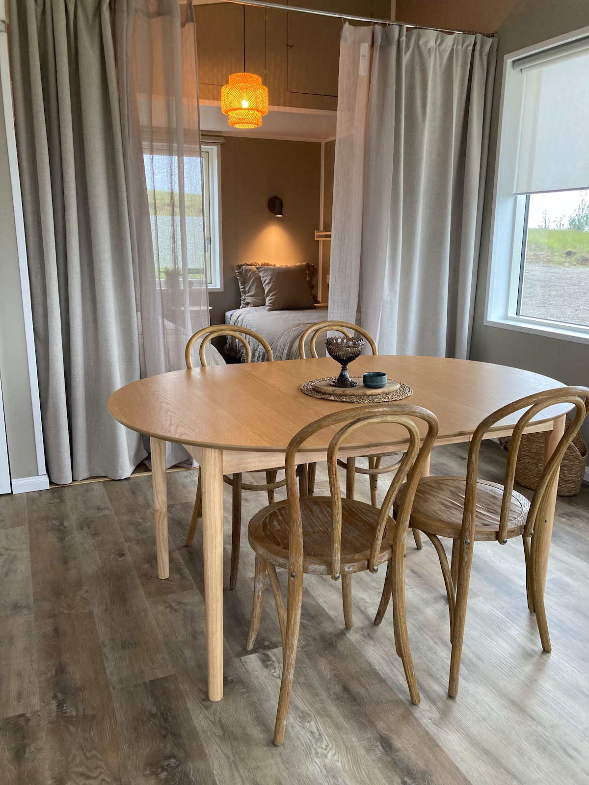 Cabanes neuves, confortables et bien conçues. La douche extérieure chaude abritée, accessible depuis la salle de bain, est une expérience agréable par tous les temps. Ils sont tous deux très privés bien qu'ils soient à deux pas de la Route 1. Excellente base pour explorer les merveilles du Sud, par exemple Gullfoss et Geysir, les îles Westmann, les belles cascades le long de la côte sud et la plage noire de Vik.