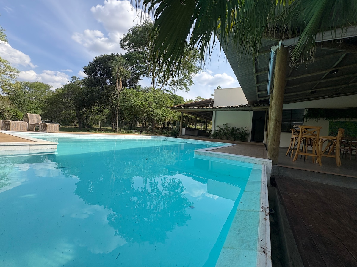 Lieu familial, avec piscine, bar et terrain de football. Confortable pour présenter une décoration rustique et un bel éclairage de la nature. Près de la ville de Senador Canedo et à 12 minutes du centre commercial Flamboyant de Goiânia. MAISON DE L'HÔTE À 150M DE L'ENDROIT. SI VOUS AMENEZ DES CHIENS, FAITES-LES VOYAGER POUR QU'ILS N'ATTAQUENT PAS LES OISEAUX DU LIEU. WIFI DISPONIBLE. NOUS NE FOURNISSONS PAS DE LINGE DE LIT. LES ENFANTS DE PLUS DE 2 ANS PAYENT NORMALEMENT. LES VISITEURS PAYENT DES FRAIS DE 70 REAIS, SAUF LES JOURS FÉRIÉS.