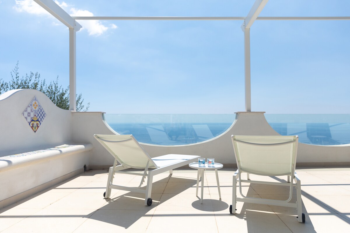 La Villa est dans une position dominante sur la mer, entourée de jardins de citronniers et d'orangers. De la terrasse, une vue imprenable qui embrasse la baie d'Amalfi de Capo Vettica à Capo d'Orso, le centre historique et la cathédrale d'Amalfi et la côte opposée de Salerne à Capo Licosa. Grâce à l'isolement d'une partie de la terrasse, il est possible de bronzer en toute intimité. À 350 m, une piscine/restaurant du Club est accessible uniquement aux conditions énumérées dans Accès pour les voyageurs.