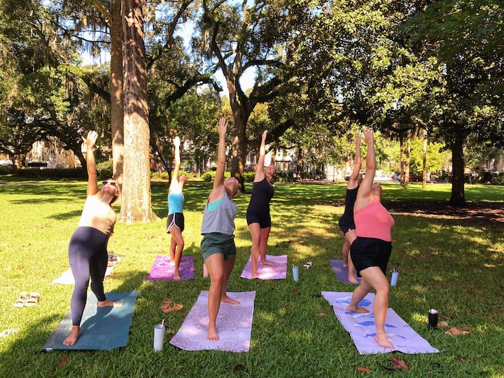 Je propose des cours de yoga dans l'emblématique Forsyth Park de Savannah, parfait pour tous les niveaux.