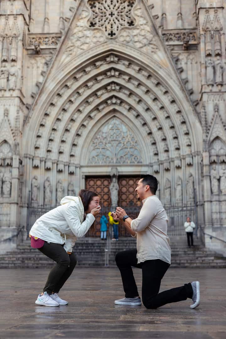 La séance photo commence à la cathédrale de Barcelone et se poursuit à travers le quartier gothique historique, capturant des rues et de l'architecture emblématiques.