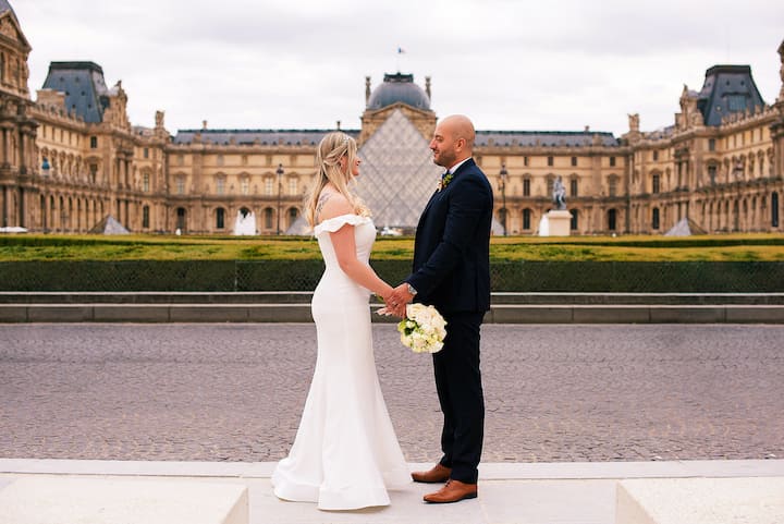 Séance photo privée avec le Louvre en toile de fond, dans des lieux enchanteurs autour du célèbre musée, en explorant des angles uniques sélectionnés par un photographe expérimenté.