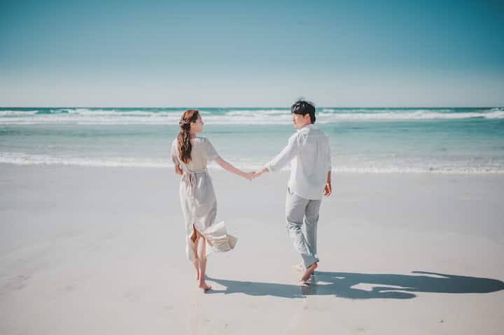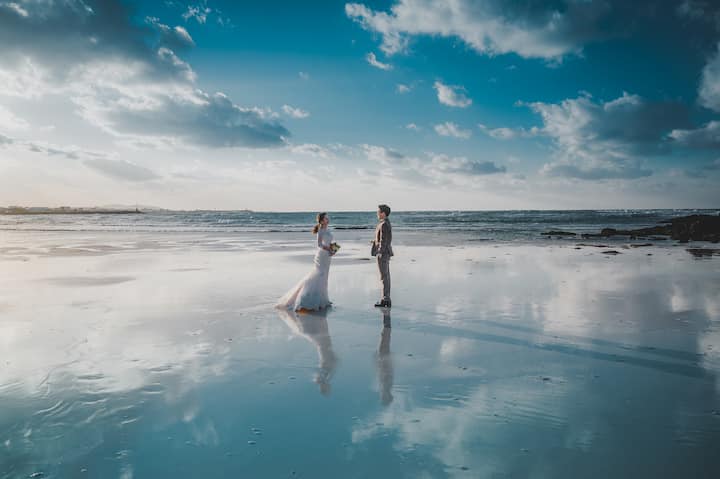 Séance photo de mariage de 3 heures avec la mer, la forêt, les prairies et les fleurs saisonnières de Jeju. Le lieu sera décidé après discussion.