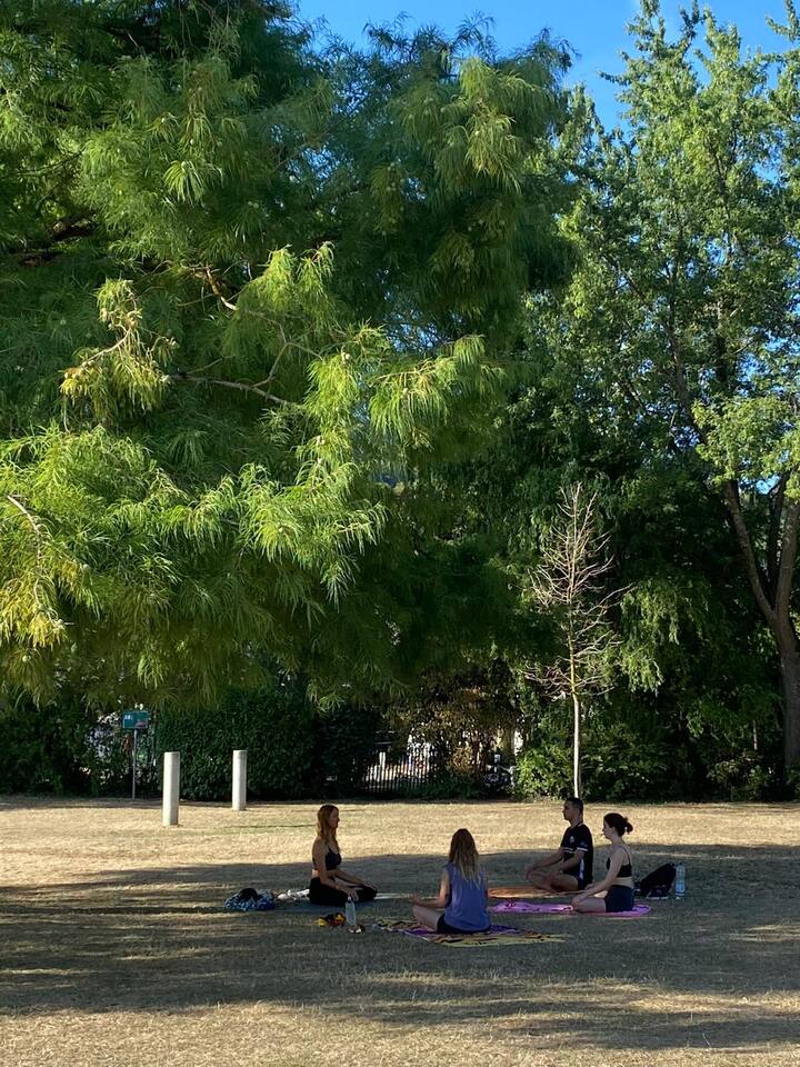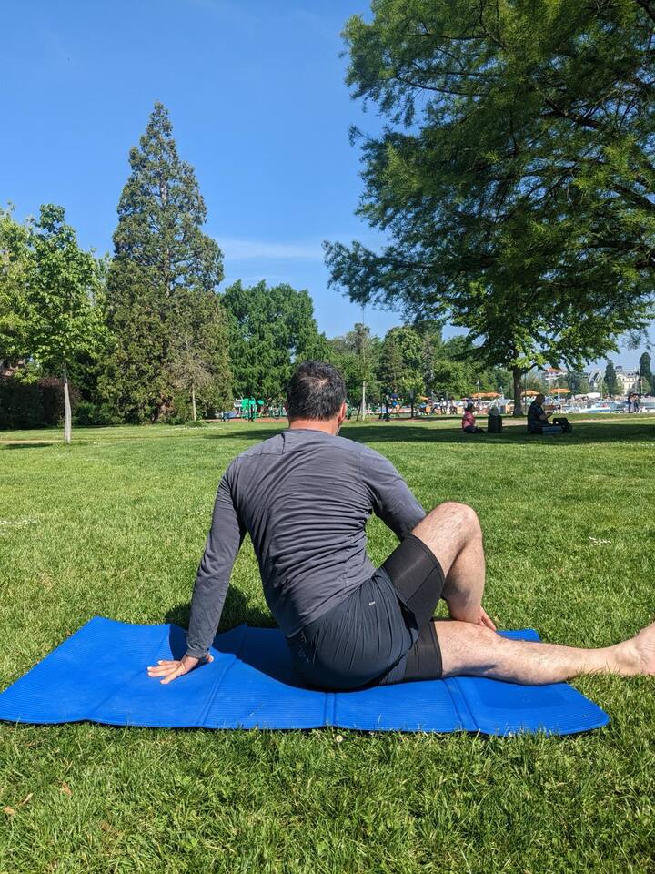 Séance de yoga au bord du lac incluant respiration pleine conscience, postures, et relaxation. Adaptée à tous les niveaux, débutants ou intermédiaires.