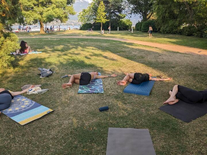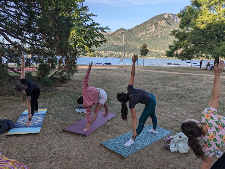 Cours de yoga au bord du lac d'Annecy, incluant des postures et une relaxation profonde.