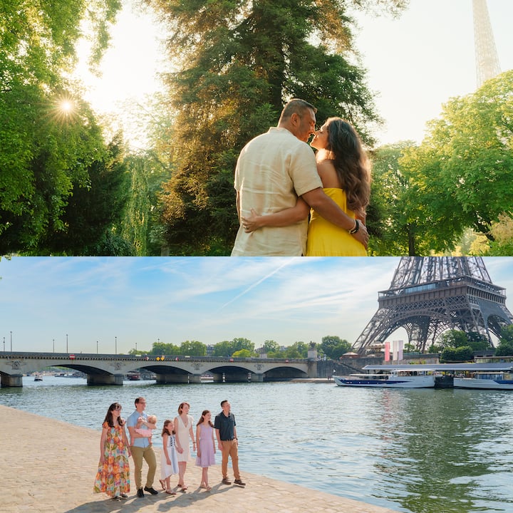 Vous rêvez de photos de la tour Eiffel? Notre séance d'une heure couvre trois lieux à distance de marche que vous pouvez choisir : Trocadéro, avenue de Camoens, Bir-Hakeim, Seine, Jardin.