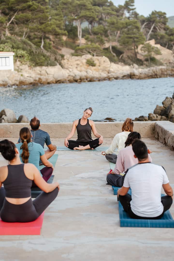 Séance de vinyasa yoga @laura.travelyoga avec vue sur la mer sur la Costa Brava, adaptée à différents niveaux. Contact pour les groupes privés, les enterrements de vie de vie, le yoga dans les hôtels et les maisons.