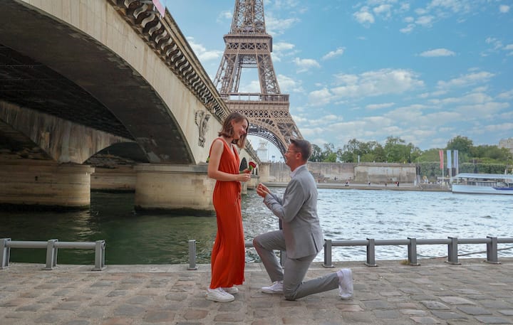 Séance photo romantique à l'emblématique tour Eiffel et Seine.