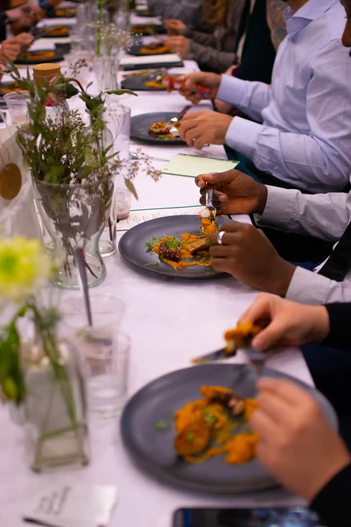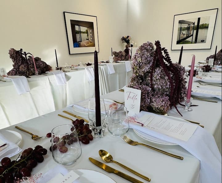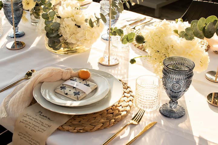 Un dîner de 3 plats avec un cocktail sans alcool de bienvenue, une ambiance tamisée, une vaisselle simple, des verres élégants, des cartes de menu, la mise en place et le nettoyage après le dîner.