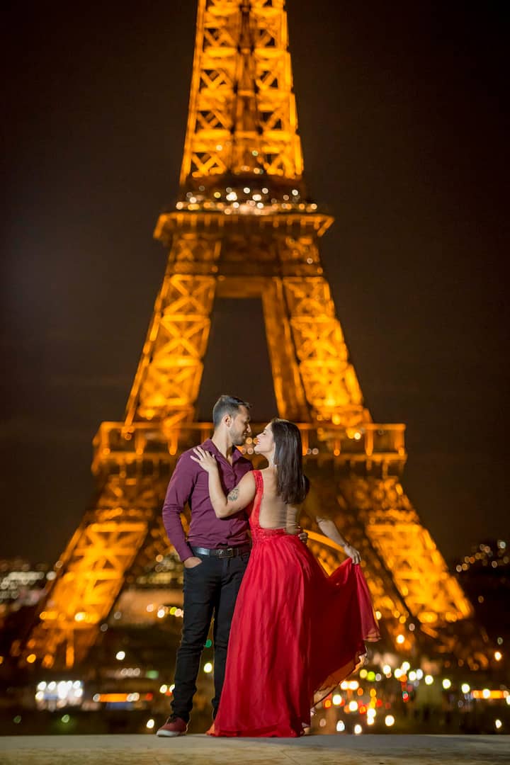 Séance photo nocturne d’1h à la Tour Eiffel illuminée. 20 photos retouchées en HD. Galerie envoyée le jour-même pour sélectionner vos préférées. Livraison finale sous 3 à 5 jours. Magie garantie !
