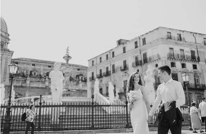 Séance photo de couple dans les rues de Palerme, en Sicile, pour célébrer votre amour en déplacement. Durée d'environ une heure. Prix pour un couple