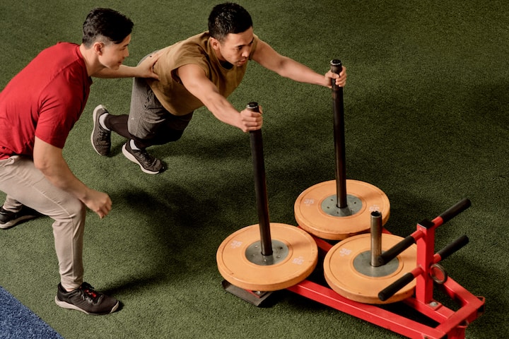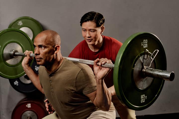 Cet entraînement est conçu pour des objectifs individuels et ouvert à tous les niveaux. Il comprend un échauffement, des exercices stratégiques, des corrections de posture et des conseils de récupération. L'entraînement peut inclure un mélange de musculation (comme des squats, des soulevés de terre, des presses et des rangées), des exercices cardiovasculaires (comme un entraînement par intervalles à haute intensité et un cardio à l'état stable) et des exercices de flexibilité. Des poids libres et des haltères spécialisés, y compris des haltères Earthquake, sont disponibles. Cette expérience a lieu dans un gym de Pasadena.