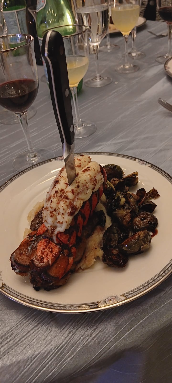 Savourez un dîner de trois plats avec un faux-filet et du homard, accompagné d'une purée de pommes de terre au beurre et d'asperges rôties.