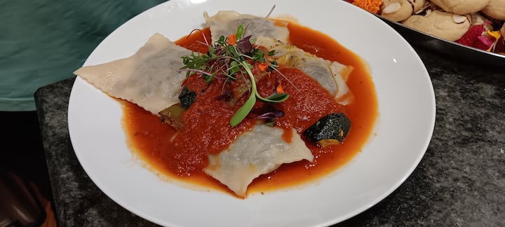 Savourez un dîner italien en quatre services avec des arancini farcis à la mozzarella, du chutney à la tomate, des raviolis faits maison et du poulet rôti.