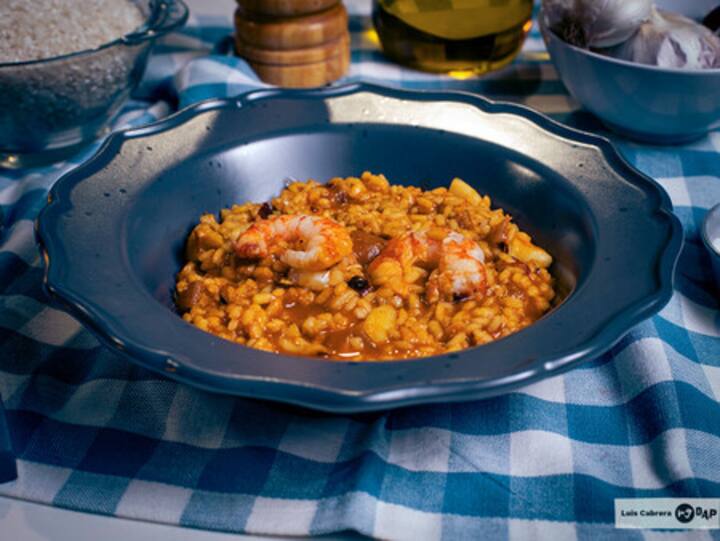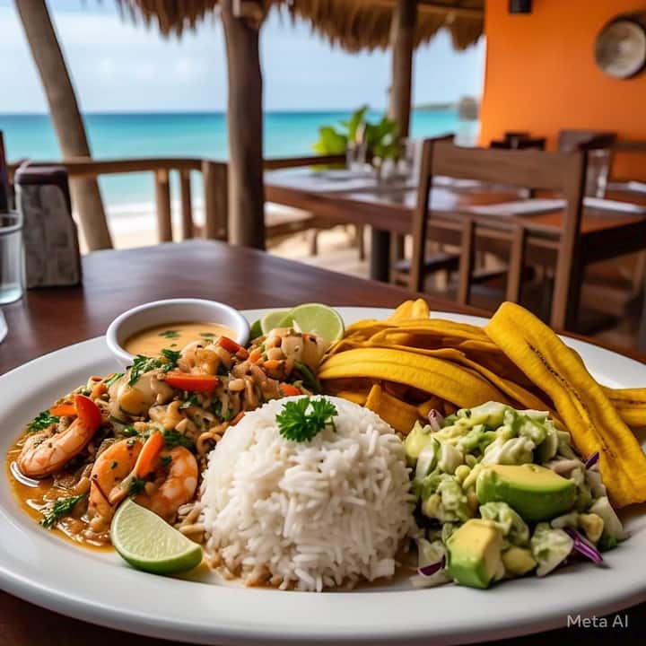 Savourez un délicieux repas de fruits de mer avec du riz aux crevettes, du ceviche et des chips de plantain.