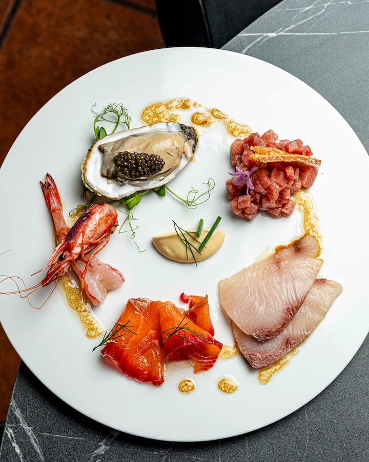 Essayez mes crevettes rouges méditerranéennes, mon oursin et mon thon, une sélection des meilleurs ingrédients de la mer, présentés dans un style CRUDO.