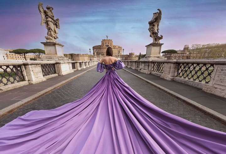 Immortalisez le mouvement et l'élégance d'une robe légère avec les monuments emblématiques de Rome en toile de fond. Cette séance vidéo est idéale pour les moments mémorables et les occasions spéciales.