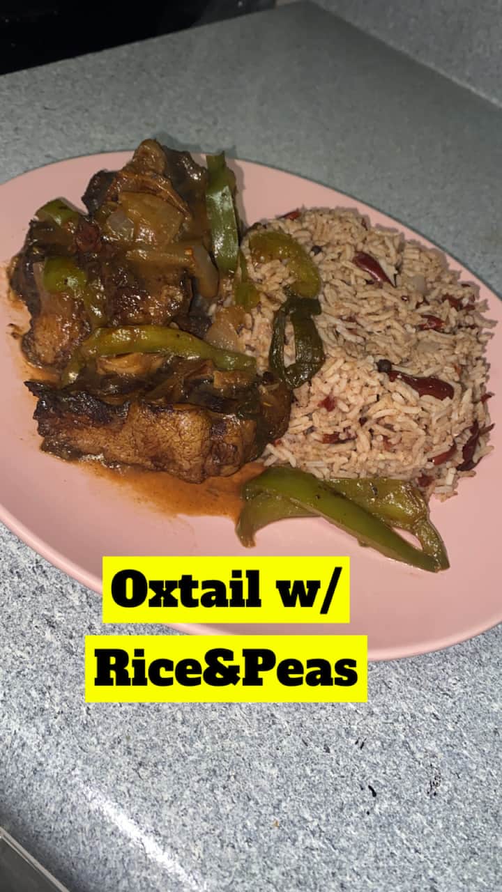 Goûtez notre queue de bœuf tendre et savoureuse, servie sur un lit de riz frit et de légumes ! À base de riz frit, de queue de bœuf, d'oignons, de pois et de carottes
