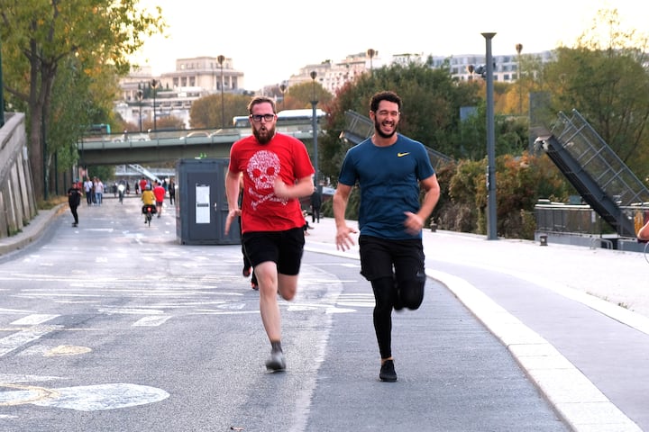 Séance de sport en petit groupe sur les quais de Seine. Activités variées, ludiques et adaptées à chaque niveau.